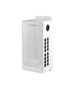 16 портовий PoE комутатор для IP видеодомофонов Hikvision. Обладнаний 12 портами RJ-45, 12 каналів для передачі даних і живлення для пристроїв (монітори / викличні панелі) по кручений парі. На «борту» є вбудований стабілізатор напруги. Підтримуються стандарти IEEE802.3, IEEE802.3u і IEEE802.3x.