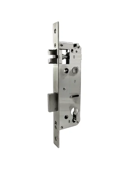 Врізний замок для дверей із посадковим розміром 45х85 мм. Автоматичне замикання — на косий ригель. Також може бути примусове замикання на прямий ригель — рухом "ручка вгору".