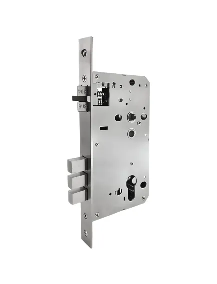Врізний замок для дверей із посадковим розміром 60х85 мм. Автоматичне замикання — на косий ригель. Також може бути примусове замикання на прямий ригель — рухом "ручка вгору".