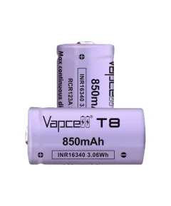 Типорозмір 16340; Ємність 850 mA•h; Напруга номінальна 3.6V; Напруга повного заряду 4.2V; Напруга повного розряду 2.5V; Струм заряду стандартний 0.5A / максимальний 1A; Струм розряду максимальний (імпульсний) 3А; Струм розряду при постійному навантаженні 3А
