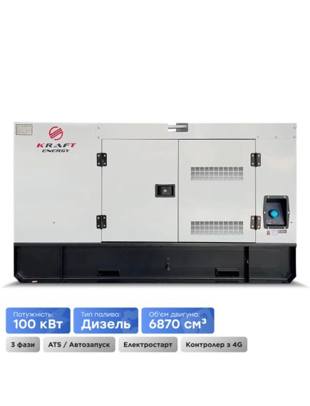 Генератор дизельний трифазний Kraft KRF-100KW/DA з номінальною потужністю 100 кВт / максимальною потужність 125 кВА, вихідна напруга 400 В. Тип запуску: електричний / автозапуск. Шестициліндровий чотиритактний двигун із безпосереднім впорскуванням із турбонаддувом, об'ємом 6870 см.куб. Об'єм паливного баку 254 л. Об'єм мастила в картері 20 л. Витрати палива 29.7 л/год.