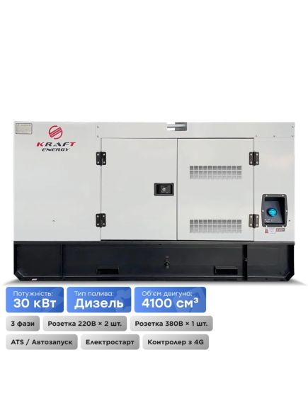 Генератор дизельний трифазний Kraft KRF-30KW/DA з номінальною потужністю 30 кВт / максимальною потужність 37.5 кВА, вихідна напруга 230/400 В, 2 розетки 230 В, 1 розетка 380 В. Тип запуску: електричний / автозапуск. Чотирициліндровий чотиритактний двигун із безпосереднім впорскуванням із турбонаддувом, об'ємом 4100 см.куб. Об'єм паливного баку 176 л. Об'єм мастила в картері 13 л. Витрати палива 8.09 л/год.