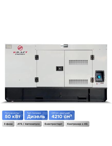Генератор дизельний трифазний Kraft KRF-50KW/DA з номінальною потужністю 50 кВт / максимальною потужність 63 кВА, вихідна напруга 400 В. Тип запуску: електричний / автозапуск. Чотирициліндровий чотиритактний двигун із безпосереднім впорскуванням із турбонаддувом, об'ємом 4210 см.куб. Об'єм паливного баку 205 л. Об'єм мастила в картері 13 л. Витрати палива 14.9 л/год.