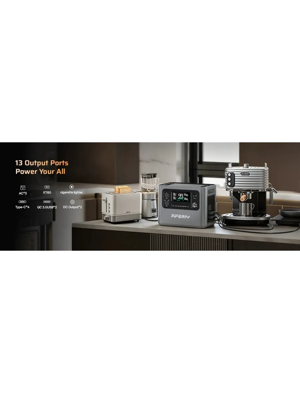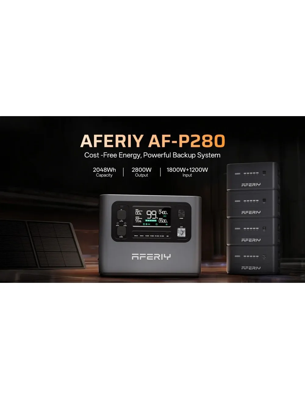 Портативна зарядна станція AFERIY P280, вихідна чиста синусоїда змінного струму 2800 Вт, акумулятор LiFePO4 ємністю 2048 Вт·год, розширювана ємність, 13 вихідних портів, швидка зарядка 1,5 години, сонячний вхід 1200 Вт, інтелектуальне керування застосунком та резервне копіювання ДБЖ 10 мс.