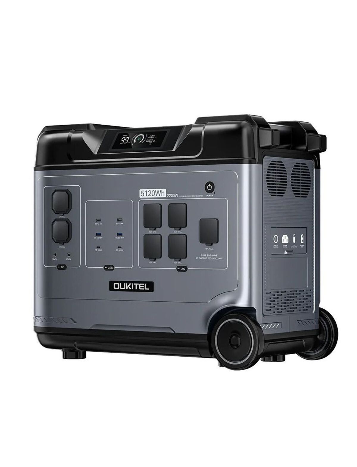 Портативна зарядна станція OUKITEL P5000E Pro з функцією ДБЖ, з номінальною потужністю 4000 Вт, піковою потужністю 8000 Вт, вихідна напруга 200-240 В, чиста синусоїда. Вбудована акумуляторна батарея LiFePO4 потужністю 5120 Втг (51.2В/100Аг). Зарядна станція може одночасно заряджати до 15 пристроїв (завдяки вбудованим вихідним портам). Можливість заряджання станції від електромережі (вбудований зарядний пристрій 1800 Вт), від сонячних панелей максимальною потужністю 1000 Вт (слід придбати окремо), від прикурювача (зарядний кабель у комплекті) та від PD-адаптера живлення (купується окремо). Час заряду від електромережі до 80% заряду – 1 година 30 хвилин, до 100% заряду – 2 години 10 хвилин.