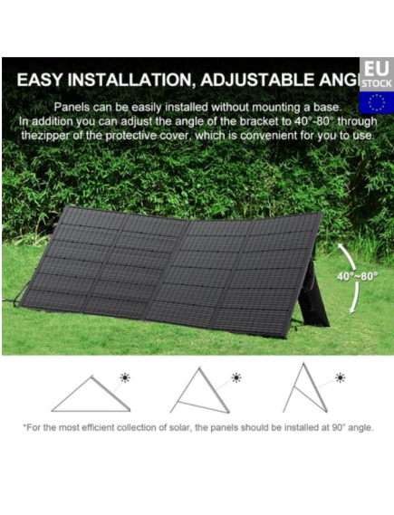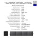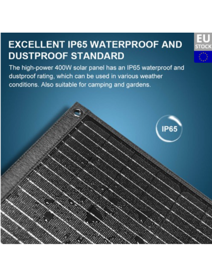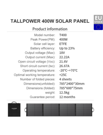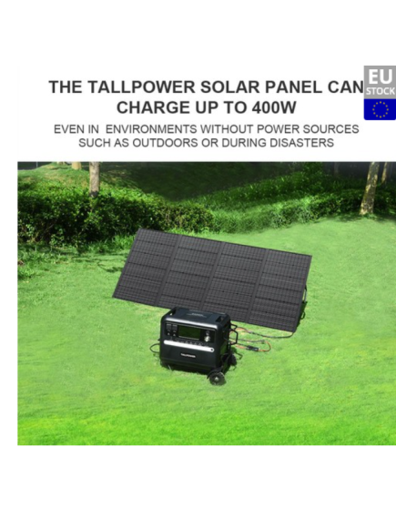 Тонка сонячна панель TALLPOWER потужністю 400 Вт легка, складна та компактна, тому її легко носити. Він має розміри 78 × 240 × 3 см і важить лише 12,5 кг, ідеально підходить для портативного використання.