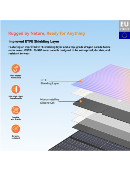 Сонячна панель OSCAL PM400 має покращений екрануючий шар ETFE та зовнішнє покриття з високоякісної тканини Dragon Parade, що забезпечує водонепроникність, міцність і стійкість до зношування.