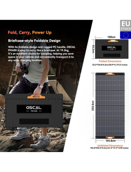 OSCAL PM400 легко носити та транспортувати завдяки складній конструкції, що нагадує портфель, і міцній ручці ПК. Вагою лише 19,2 кг, це чудовий вибір для кемпінгу, який допоможе вам заощадити місце у вашому транспортному засобі та зручно транспортувати його до будь-якого місця сонячної зарядки.