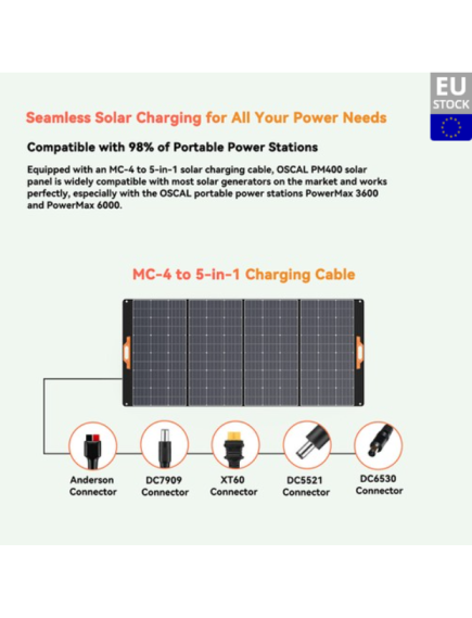 Сонячна панель OSCAL PM400, оснащена зарядним кабелем від сонячних батарей MC-4 до 5-в-1, широко сумісна з більшістю сонячних генераторів на ринку та ідеально працює, особливо з портативними електростанціями OSCAL PowerMax 3600 та PowerMax 6000.