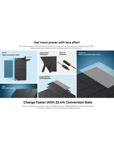 З високоефективними монокристалічними сонячними елементами до 23,4% SP420 працює краще, ніж полікристалічні сонячні панелі з аналогічним рейтингом в умовах слабкого освітлення. Це дозволяє вам насолоджуватися пригодами на свіжому повітрі, поглинаючи сонячну енергію під час походів, кемпінгу, фургонів, трейлерів, човнів, сараїв і кабін.