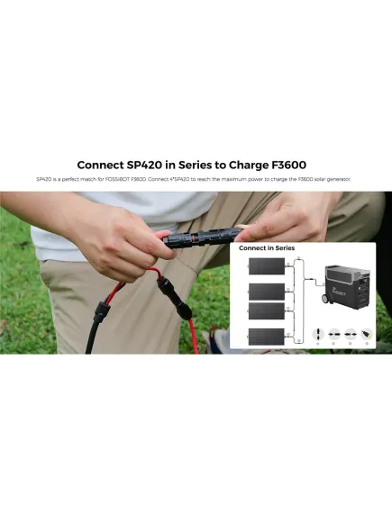 SP420 ідеально підходить для FOSSiBOT F3600. Завдяки 4 сонячним панелям SP420 F3600 можна повністю зарядити приблизно за 2 години 16 хвилин. Ця сонячна панель потужністю 420 Вт із зарядним кабелем 3-в-1 призначена для використання з більшістю сонячних генераторів на ринку.