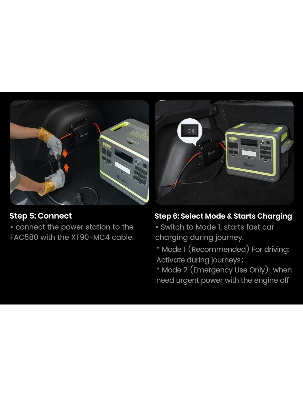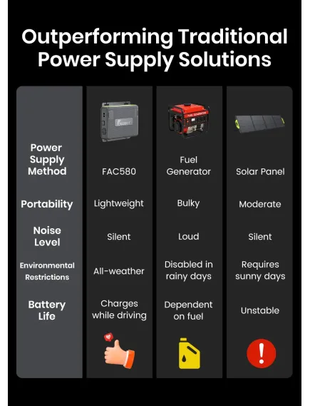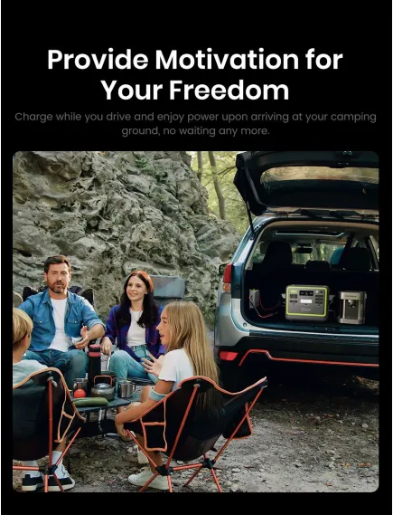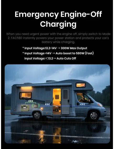 Високоефективне заряджання Зарядний пристрій-генератор FOSSiBOT FAC580 забезпечує потужність до 580 Вт, заряджаючи пристрої у 6 разів швидше, ніж стандартні автомобільні зарядні пристрої від прикурювача. Така ефективність гарантує постійну готовність ваших пристроїв до роботи — як у тривалих подорожах, так і під час щоденних поїздок.
