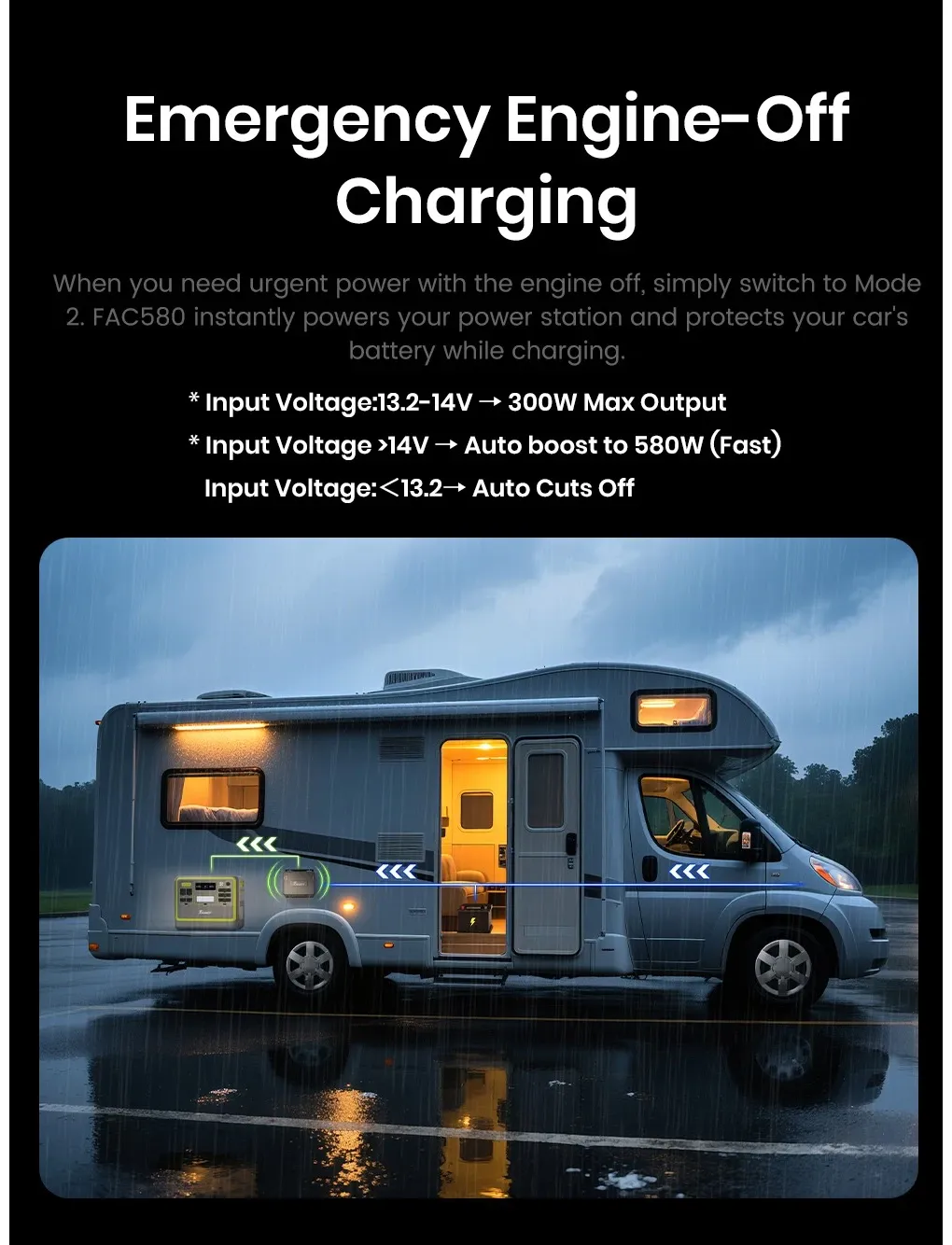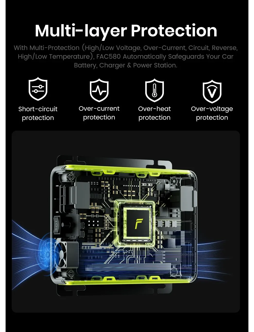 Розширені функції безпеки Багаторівнева система захисту забезпечує безпечну експлуатацію: захист від короткого замикання, перевантаження струмом, перегріву та перенапруги. FAC580 автоматично захищає аккумулятор автомобіля, зарядний пристрій та електростанцію, даруючи вам спокій під час подорожей.