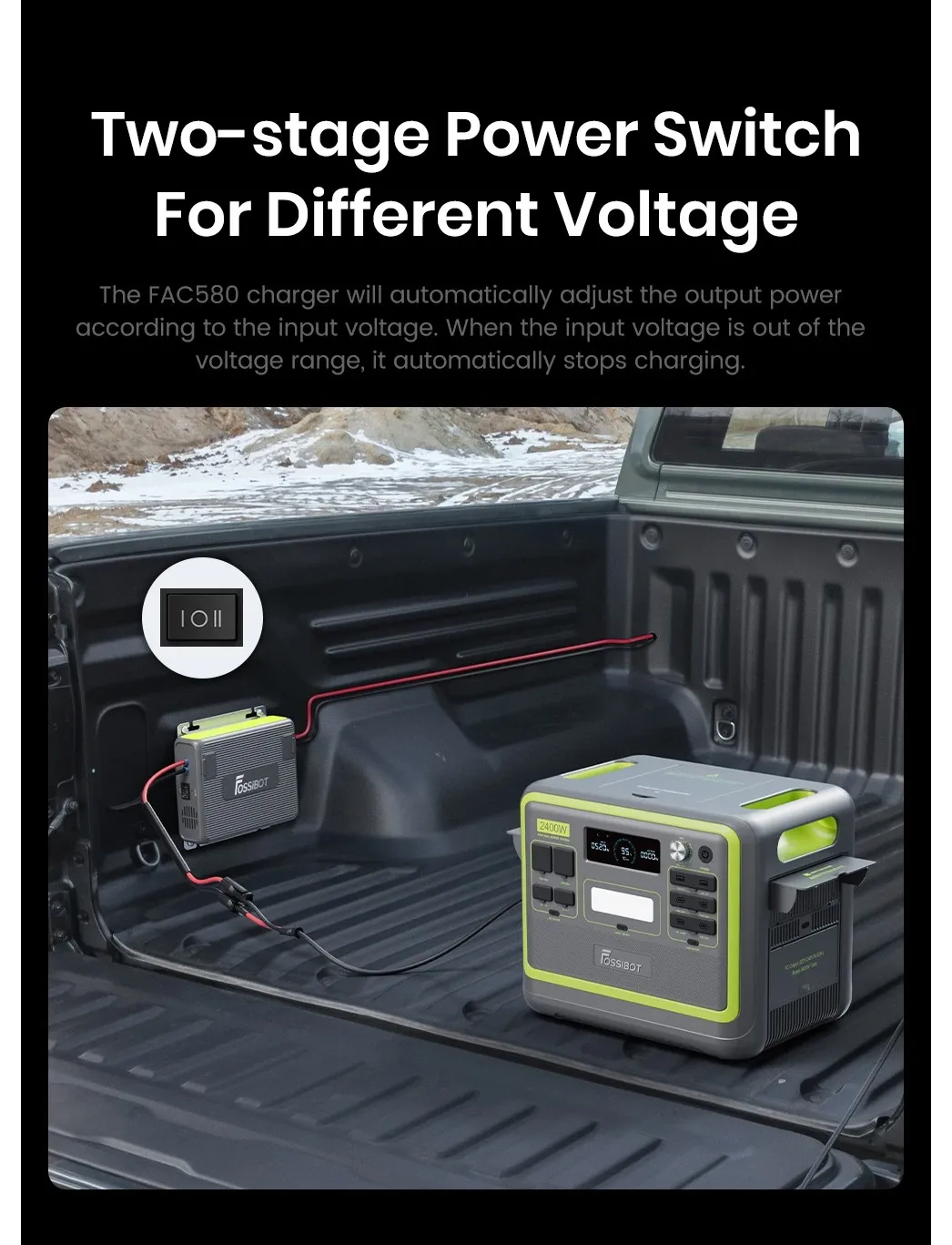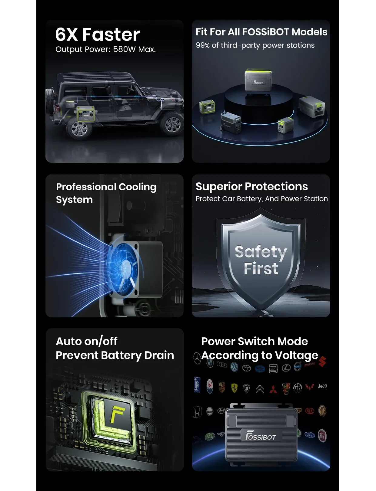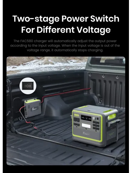Універсальна сумісність FAC580 розроблений для всіх моделей FOSSiBOT та сумісний із 99% сторонніх електростанцій. Він підтримує роботу з різними типами акумуляторів: свинцево-кислотними AGM, гелевими, LiFePO4 та блоками NMC/NCA, що робить його універсальним рішенням для різних транспортних засобів та систем живлення.