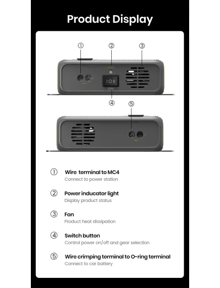 FAC580 має зручну конструкцію, що дозволяє легко встановити та використовувати пристрій. Монтаж включає підключення кабелів, їхнє прокладання, з'єднання з аккумулятором та закріплення зарядного пристрою в автомобільній розетці. FAC580 також має перемикач живлення, який автоматично регулює вихідну потужність залежно від вхідної напруги — для максимально ефективного та безпечного заряджання.