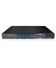 24-портовий керований L2 POE комутатор. Downlink порти: 24x RJ45 (1000M) з підтримкою PoE; Uplink порти: 4x SFP (1000M); Протокол PoE: IEEE802.3af (PoE), 802.3at (PoE +); Грозозахист до 6кВ і ESD захист 8кв; AC 100 ~ 240В, 390Вт; 0º до + 55ºC; 442х320х44 мм.