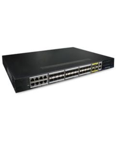 24-портовий керований L3 комутатор. Downlink порти: 24x SFP (1000M) та 8x RJ45 (1000M) комбо; Uplink порти: 4x SFP (10Гб); Управління: Web / CLI L2 / L3; Грозозахист до 6кВ і ESD захист 8кв; AC 100 ~ 240В, підтримка резервного живлення; 0º до + 55ºC; 442х320х44 мм.