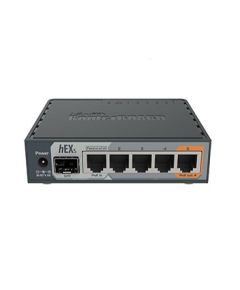 5-портовий маршрутизатор. RouterOS L4, CPU 880 МГц, RAM 256 Мб. Downlink порти: 4x RJ45 (1000M); Uplink порти: 1x RJ45 (1000M), 1x SFP (1.25Гб / с); USB 2.0. DC 12В-57В, passive PoE і 802.3af / at на 1м порту. -40º до + 70ºC; 113х89х28 мм.