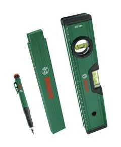 Універсальний набір для розмітки, що включає міцну, високоякісну нейлонову складну рулетку довжиною 2 м, армовану скловолокном, 25-сантиметровий рівень з точністю до 0.05 мм/м, який легко читається як по горизонталі, так і по вертикалі, а також висувний олівець, який можна використовувати як...