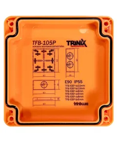 ● Клас вогнестійкості: Е90; ● Кабельні вводи: 6; ● Клеми: 4 полюси Ø 3.5 мм; ● Клас захисту: IP55; ● Розміри: 107 х 107 х 57 мм