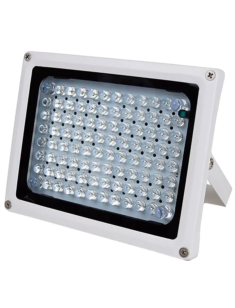ІЧ-прожектор, дальність 100м, кут 30°, довжина хвилі 850 нм, 220 В / 0.7 А, 96 ІЧ-діодів, розміри 180 х 140 х 80 мм, вуличне виконання IP66. Автоматичне увімкнення ІЧ-підсвічування в нічний час і вимикання в денний. Колір білий, метал, -35° - + 40° С.