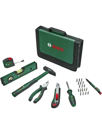 ● До набору інструментів Bosch входять комбіновані плоскогубці, універсальна викрутка, молоток 300 г, висувний ніж, рулетка 3 м, спиртовий рівень 25 см, маркер глибоких отворів, 18 біт: PH1/2/3, PZ1/2/3, SL4/5/6, Torx10/15/20/25/30, HEX3/4/5/5/6;