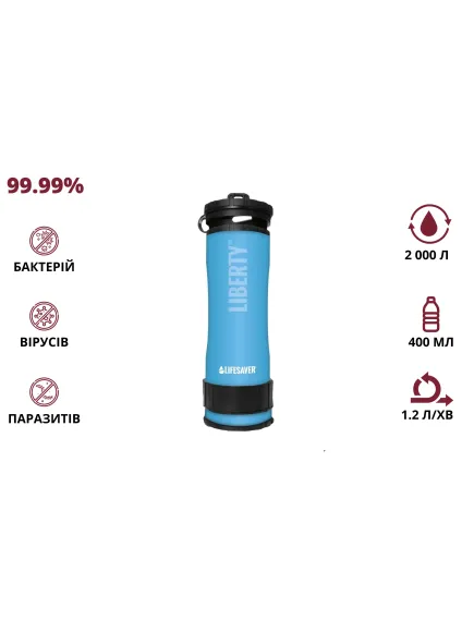 Пляшка для очищення води LifeSaver Liberty™ - це перший і єдиний у світі портативний очищувач води, що є пляшкою з вбудованим насосом. Використовуючи ту ж передову технологію фільтрації, що й оригінальна пляшка LifeSaver, пляшка для очищення води LifeSaver Liberty™ є меншою, легшою та універсальнішою версією, але при цьому міцною і простою у використанні. Найкраща пляшка для очищення води для любителів активного відпочинку, мандрівників, туристів або тих, кому потрібне надійне джерело питної води. Технологія FailSafe – коли мембрани фільтра заблоковані, вода не може пройти, що забезпечує безпеку користувачів. Матеріали продукту та очищена вода не містять BPA та BPS. Швидкість потоку – 1,2 л/хв. Ресурс до 2000 л. Ємність: 400 мл